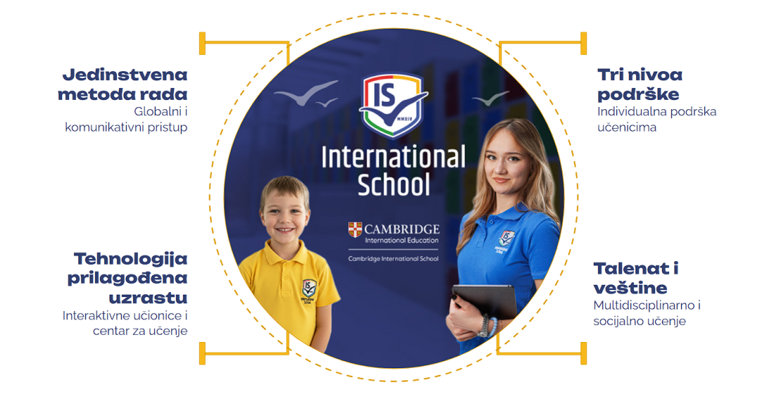 International School je zvanično akreditovana Cambridge International School sa jedinstvenim, inovativnim, svetski nagrađivanim pristupom i metodama rada koje garantuju uspeh. Najsvremenije okruženje u kome se odvija nastava na engleskom, mentorski rad i primena tehnologije spajaju se sa prepoznavanjem talenata, multidisciplinarnim znanjima i razvojem društvenih veština. U modernoj zgradi opremljenoj interaktivnim učionicama, centrom za učenje i bibliotekom, deca uče zato što žele—rastу uz podršku, istraživanje i prijateljstva koja traju.