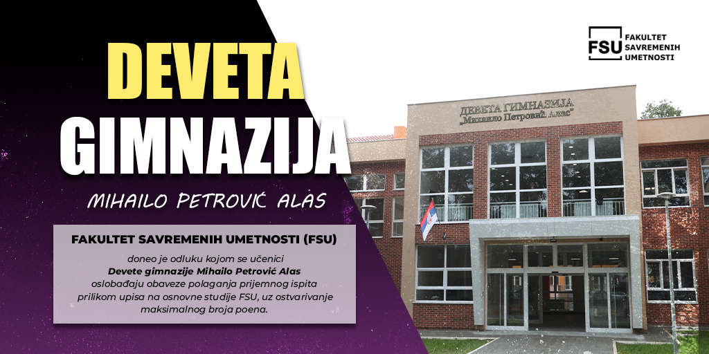 Fakultet savremenih umetnosti (FSU) doneo je odluku kojom se učenici Devete gimnazije Mihailo Petrović Alas oslobađaju obaveze polaganja prijemnog ispita prilikom upisa na osnovne studije FSU, uz ostvarivanje maksimalnog broja poena.