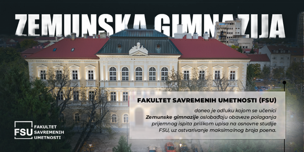 Fakultet savremenih umetnosti (FSU) doneo je odluku kojom se učenici Zemunska gimnazija oslobađaju obaveze polaganja prijemnog ispita prilikom upisa na osnovne studije FSU, uz ostvarivanje maksimalnog broja poena.