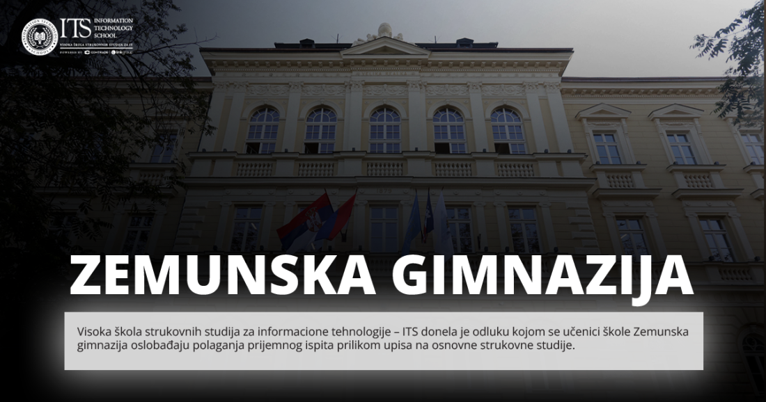 Visoka škola strukovnih studija za informacione tehnologije – ITS donela je odluku kojom se učenici škole Zemunska gimnazija oslobađaju polaganja prijemnog ispita prilikom upisa na osnovne strukovne studije.
